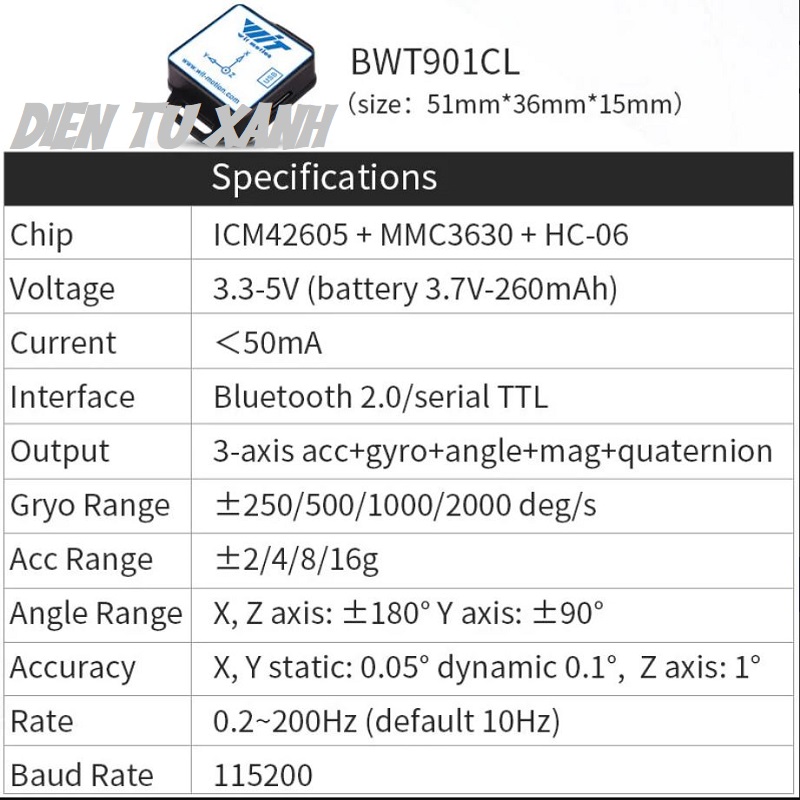 MIÊU TẢ CẢM BIẾN IMU 9 TRỤC, BWT901CL, Bluetooth 2.0